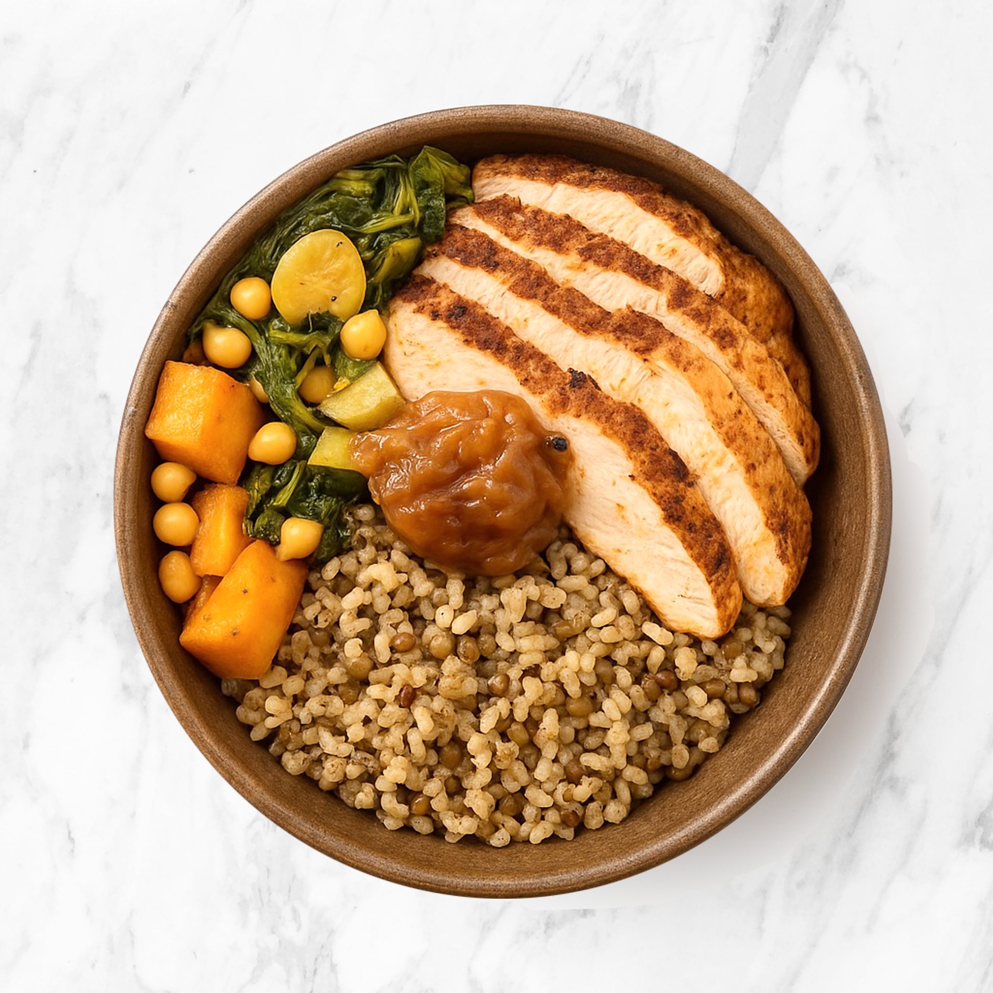 Chettinad madras chicken, sweet potato saag aloo, grain mix and lime pickle