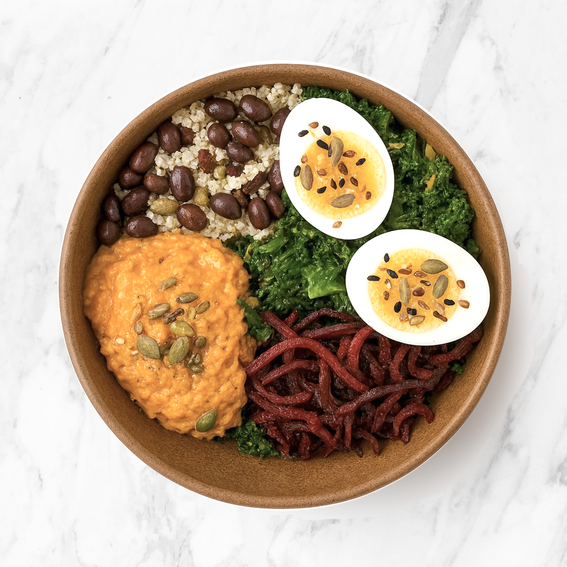 Ingredients: Tricolor Quinoa Lentils green Brown Rice Black beans tin Lime Juice Salt Oil Rapeseed Beetroot Raw Red Carrot Cabbage (Red) Rice flour Water Chilli flakes Garlic Fresh Ginger fresh Onion Red Aubergine Fresh Sundried Tomato Tomatoes Chopped Red pepper Fresh Dates (dried, chopped) Lemon Juice fresh Cider Vinegar Kale Broccoli Tarragon Dill fresh Mustard Wholegrain Eggs Pumpkin seeds Chia Seed Mix Sunflower seeds Linseed golden Nigella Seeds Sugar brown demerara Black Pepper Cracked